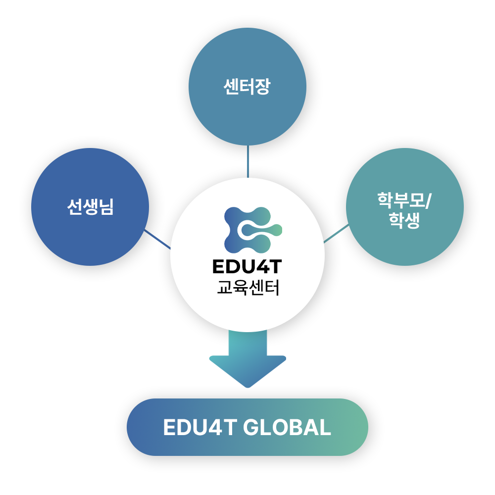 EDU4T.com은 학생, 학부모, 센터장을 연결하고, 글로벌 교육으로 연결 확장하는 통합 교육 생태계 입니다.